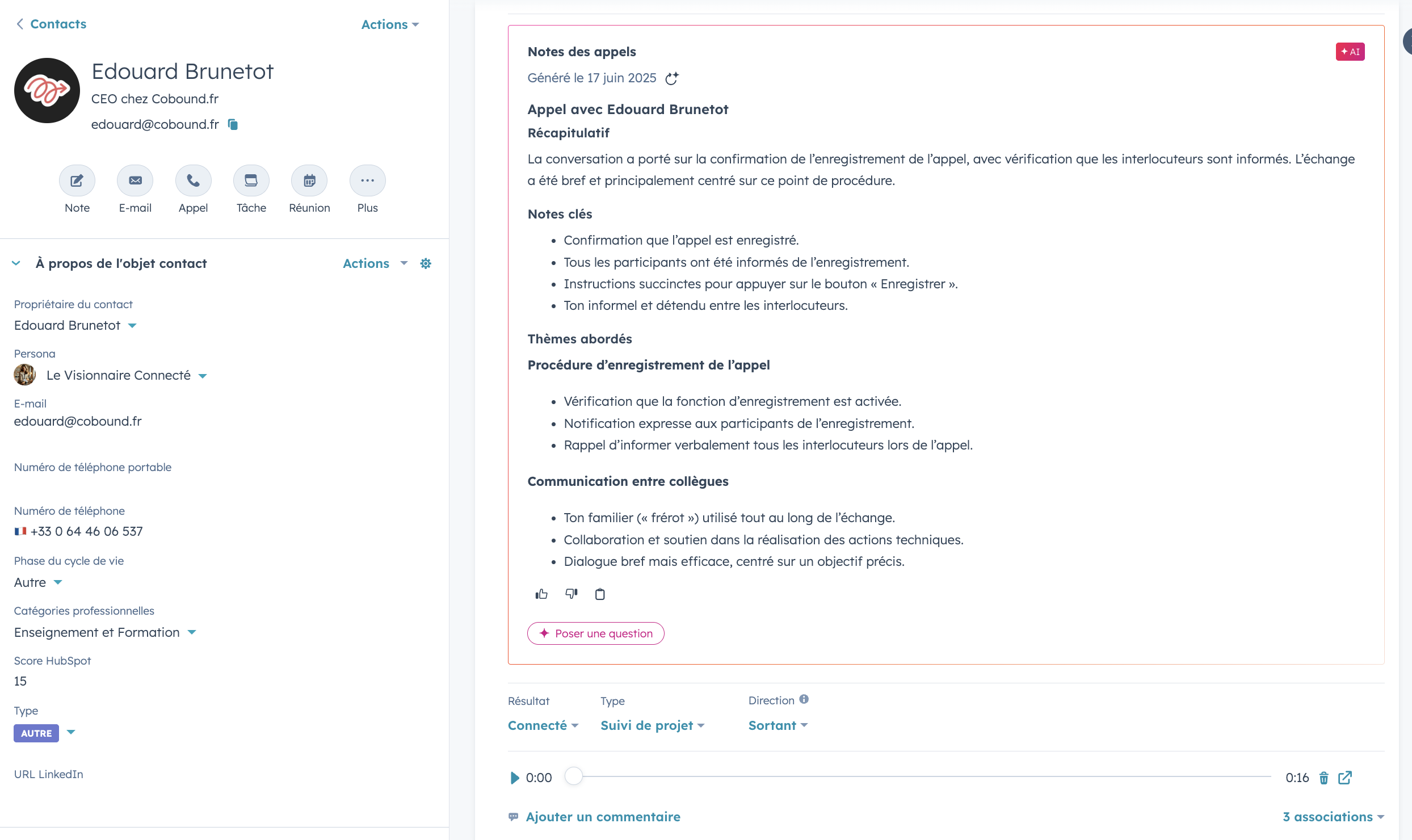 Vous retrouvez ci-dessus une synthèse structurée de l’échange, générée et restituée par Breeze IA, intégrée à HubSpot.
