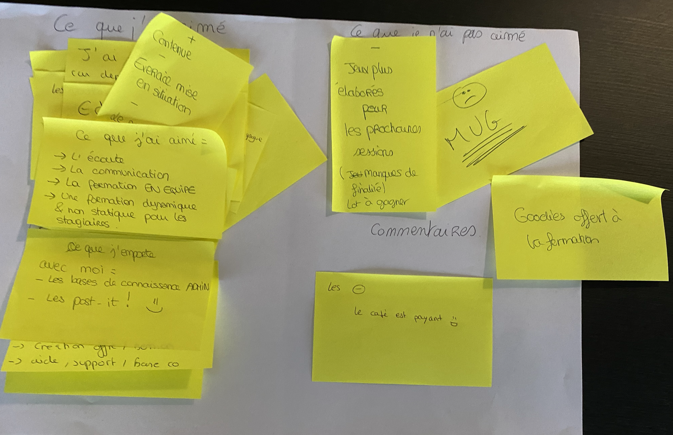Astuce : Après chaque session, invitez chaque participant à déposer anonymement sur des post-its ce qu’ils ont apprécié et ce qu’ils aimeraient voir évoluer.